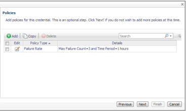 Optional—On the Policies page, define one or more policies for this credential. A policy defines the number of times a credential can be used, the number of allowed authentication failures, the time range during which the credential is valid, or the length of time the credential data can be cached on the client. For example, you can specify the number of times the credential can be used, or the time period during which it can be used. For complete information about the available credential policies, see the Administration and Configuration Help. |