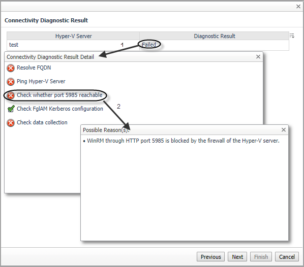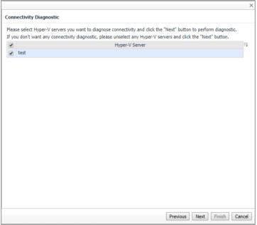 On the Connectivity Diagnostic page that appears, select the Hyper-V servers you want to diagnose connectivity and click Next to perform diagnostic. If no connectivity diagnostic is required, unselect any Hyper-V servers and click Next. |