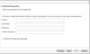 New credentials. Click New Credential and use the Create Credential Wizard that appears to provide the required information. For more details, see Step 10. |
