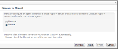 Hyper-V Agents only. On the Discover or Manual page that appears, you can indicate if you want to manually specify the Hyper-V Server that you want to monitor, or to choose between the servers running in a given domain. |