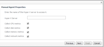 Manually specifying a Hyper-V Server only. On the Manual Agent Properties page that appears, specify the information needed to search for the running Hyper-V servers. |