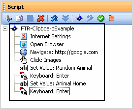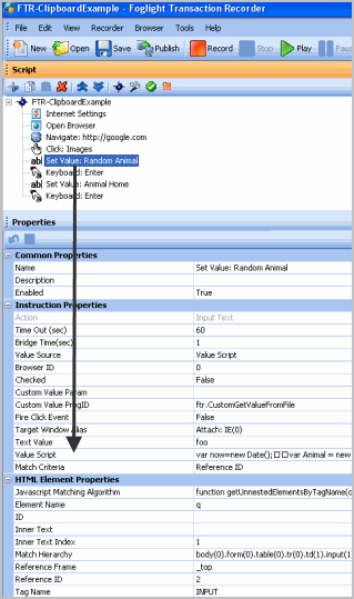 This script builds upon the FTR-Random Input example in the previous procedure. The first input is selected randomly from a list. A “Value Script”, viewed in Instruction Properties, saves the random number generated to the clipboard.