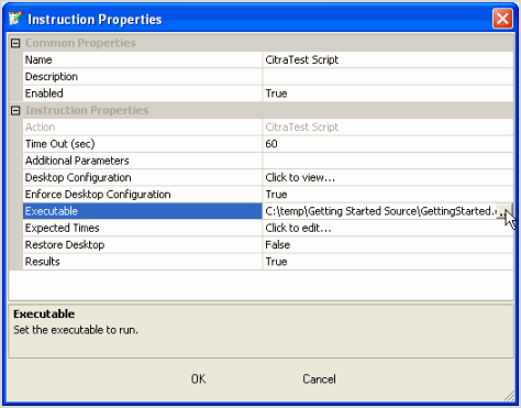You must point the GettingStarted.exe file used in the sample script to the Foglight Transaction Recorder. Right-click the CitraTest Script transaction, and select Properties. |