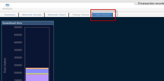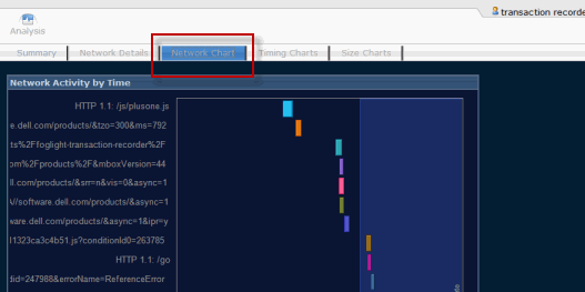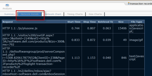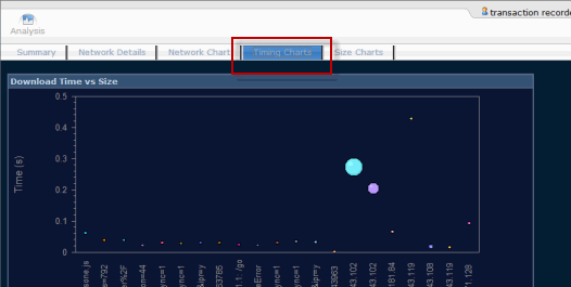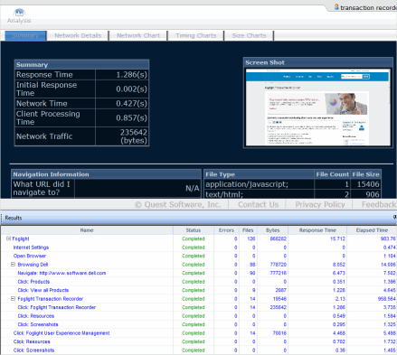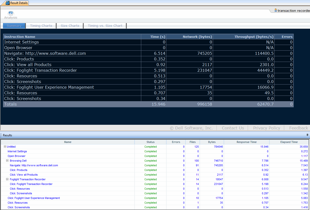 After playing back a script, the Foglight Transaction Recorder window provides charts to analyze script results. You can analyze detailed results of individual transactions, including download times, sizes, throughput, network results, and errors.