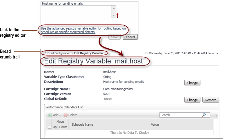When you finish updating the variable in the Edit Registry Variable view, click Save. Use the bread crumb trail at the top to return to the Email Configuration dashboard.