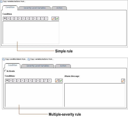 A rule condition is a type of expression that can be true or false. When it evaluates to true, the rule is said to fire, causing any actions that are associated with the rule or severity level to be performed. You can configure a rule to perform one or more actions upon entering or exiting each state. When a multiple-severity rule fires, an alarm also appears in Foglight.