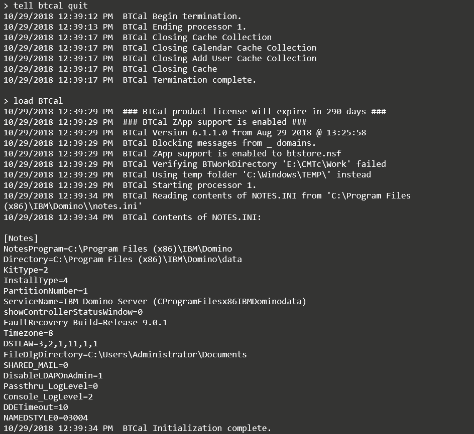 If the Domino server is already running, restart BTCal. To do this, first execute the quit command to stop the BTCal task: