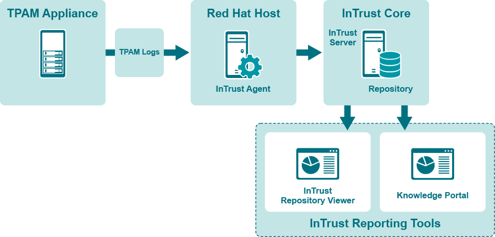 1. TPAM logs such as user and sys-admin activity are forwarded to a Red Hat or Oracle Linux host with installed InTrust agent acting as a Syslog listener.