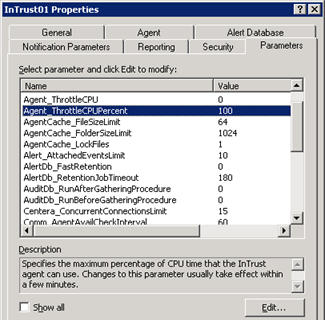 Properties of an InTrust server, Parameters tab The selected server and all of its agents, unless overridden on individual agents