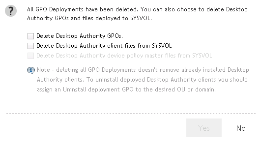 If both checkboxes, Delete Desktop Authority Client Files from SYSVOL and Delete Desktop Authority Device Policy Master files from SYSVOL are selected, the Desktop Authority folder under SYSVOL will be removed along with all the folders and files underneath it. The default path to this folder is C:\WINDOWS\SYSVOL\sysvol\[domain]\Policies\Desktop Authority.