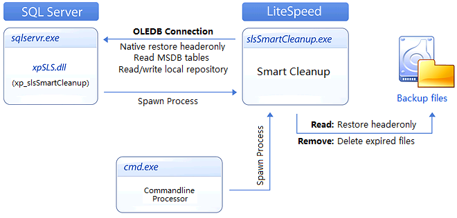 The diagram below shows how the LiteSpeed components communicate to SQL Server to check if backups are eligible for cleanup and delete them each time Smart Cleanup Policies runs.