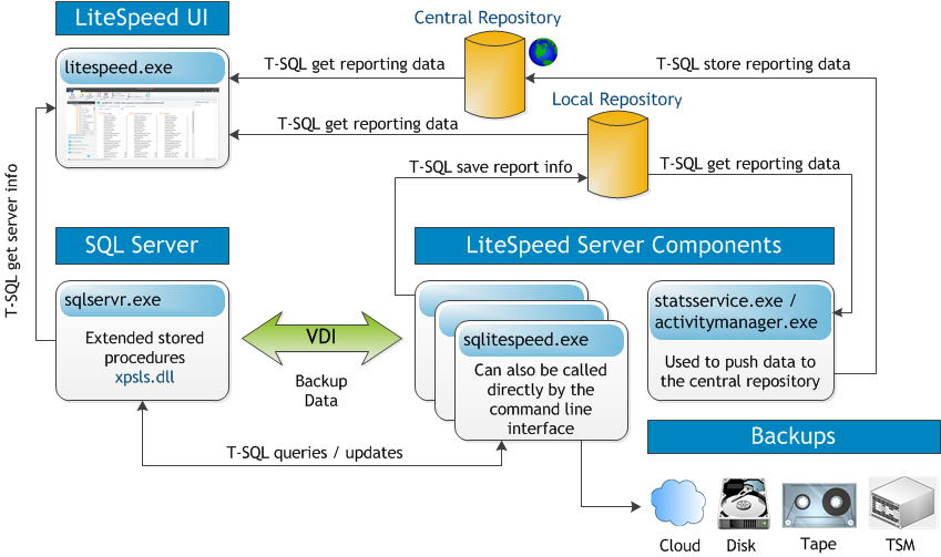 The diagram below shows how the LiteSpeed components communicate to SQL Server to create a backup and how data gets into the local repository and then is pushed to the central repository.