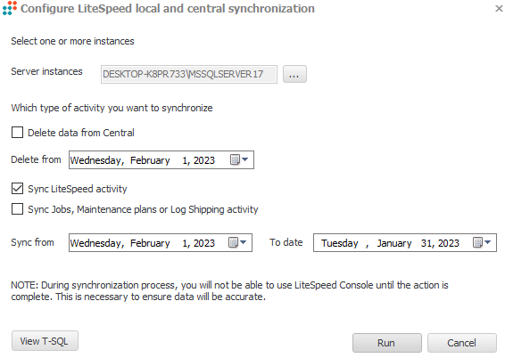 NOTE: Run the LiteSpeed_SyncActivity_Stats procedure against the desired Local database that is installed on the SQL Server from which you want to synchronize data to the Central database.LiteSpeed databases (Local and Central) by default are named LiteSpeedLocal and LiteSpeedCentral.