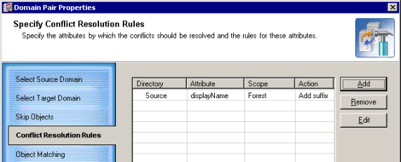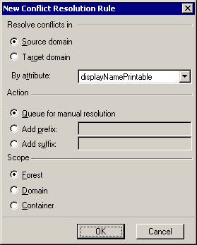 You can specify the attributes that are to be unique within the given scope (forest, domain, or container) on source and target, and the action to be performed if these attributes are not unique (i.e., two or more objects exist with the same value for a specified attribute). This is done by setting conflict resolution rules.