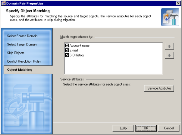 The service attributes are used by the agent to store its internal information. Click Service Attributes on the Match target objects by dialog box to specify the attributes for each of the source and target object classes.