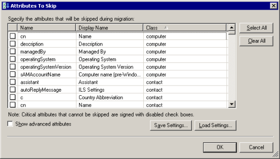 If you want to skip particular attributes, click the Attributes to Skip button. Then select the check boxes next to the attributes you do not want to migrate to the target domain.