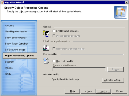 Specify whether the target objects should be enabled after the migration session is completed. This setting makes sense if the users start using their target accounts immediately after the migration is completed. You may also want to disable source accounts after migration has been completed. Use the Enable target accounts and Disable source accounts options.