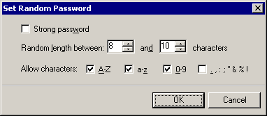 • Set random password—Sets the password to a random value generated by some criteria. The passwords are stored in ADAM or AD LDS. You can select to generate strong or custom passwords. For custom passwords, you can set the range for the password length and the allowed characters.