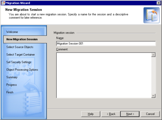 To create a new migration session, right-click the Migration node under the appropriate domain pair and select New Session from the shortcut menu. This will start the Migration Wizard.