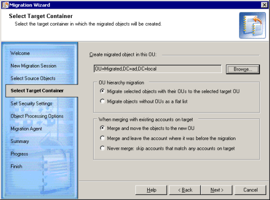 You also can specify whether the OU hierarchy will be migrated and whether the accounts should be merged with the existing target accounts.