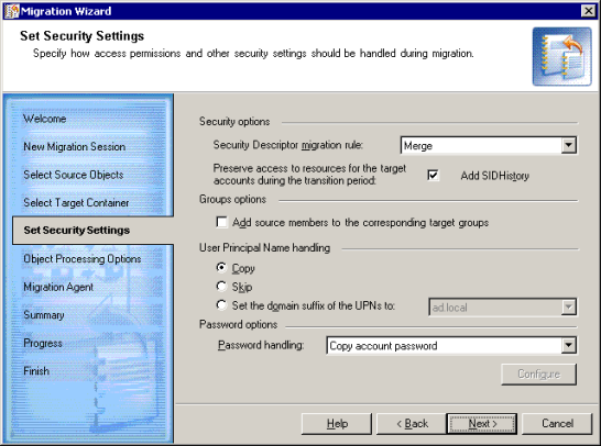 Regardless of the option you select to migrate security descriptors (Merge, Skip, or Replace) for each newly created target object, the default security descriptor defined for that object class will also be applied.