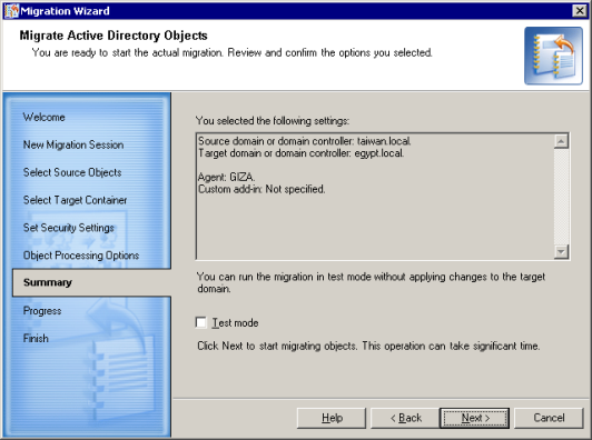Select the Test mode check box if you want to run the migration in test mode, which does not apply any changes to the real target environment. Running a migration session in test mode allows you to check how the settings you made for the session will be applied to the target directory and decide whether these settings suit your needs. You can review the results by clicking View log after the migration is completed.