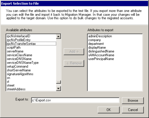 To create an export file, click Export. In the Export Selection to File window, select the attributes you want to export for the selected users. This creates a tab-delimited list: the first column is the source object's DN, and the remaining columns are the selected attributes. The administrator can later modify the attribute values in this file and import it back by clicking Import. The modified attribute values will be applied to the target objects during migration.