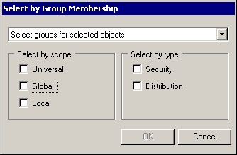 • Select groups for selected objects—Select the groups in which the selected objects are members. You can also specify the scope (global, local, or universal) and type (security or distribution) of groups for which to perform the select operation.