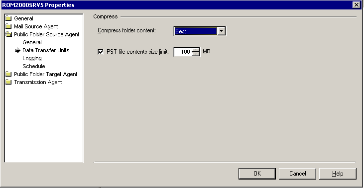 The Public Folder Source Agent compresses the PST files before putting them into service PUB files and sending them to the destination servers. The Data Transfer Units page of the source server properties allows you to select whether the agent should compress public folder data and to specify the compression rate. If the agent does not compress data, it works faster; however, the network traffic increases because larger files are transferred to the target servers.