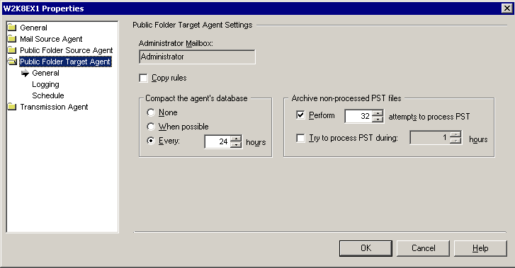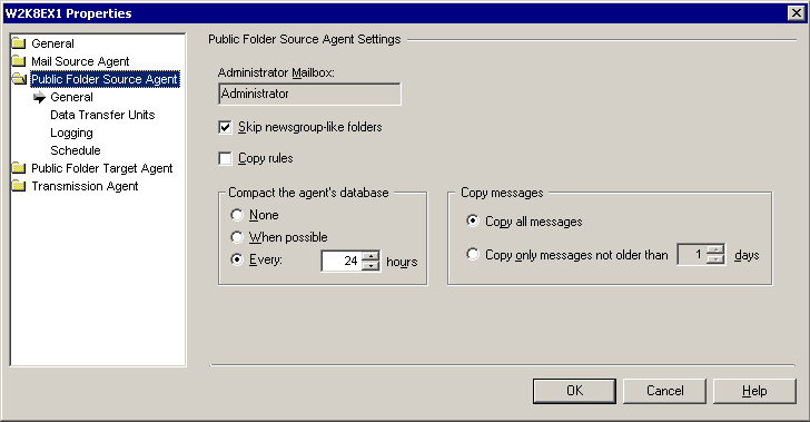 You can set scheduling, logging, and other options for each public folder synchronization agent. The Source Server Properties and the Target Server Properties dialog boxes allow you to configure the Public Folder Source Agent, Transmission Agent, and Public Folder Target Agent on every server involved in the migration. To open the dialog box, right-click the appropriate server in the management tree and select Properties from the shortcut menu. For more details, see the related topics.