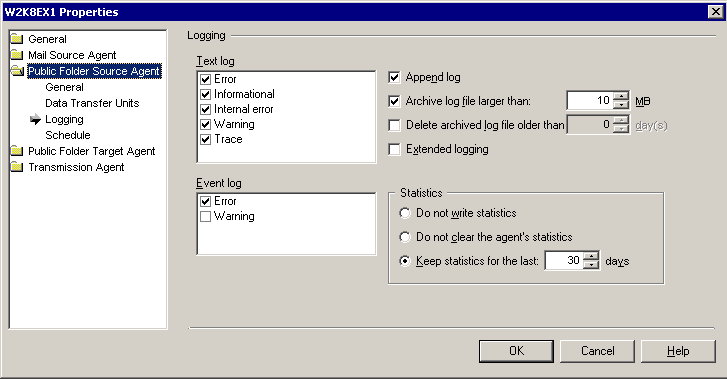 For each agent, you can specify whether the log file will be overwritten or appended during each session. You can also select which events will be written to the text log and to the Exchange server application log files.