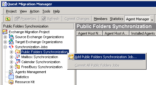 To create a new public folder synchronization job, right-click the Public Folders Synchronization node of the console management tree and select the Add Public Folders Synchronization Job option from the shortcut menu.