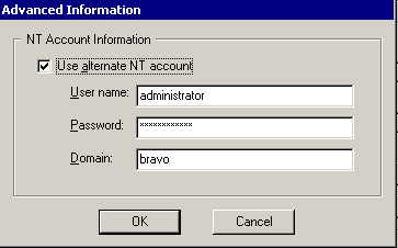 Migration Manager will retrieve the public folder hierarchy using the mailboxes you specify. If you are logged on under an account that does not have access to these mailboxes, click Advanced to use an alternate NT account to retrieve the hierarchy.