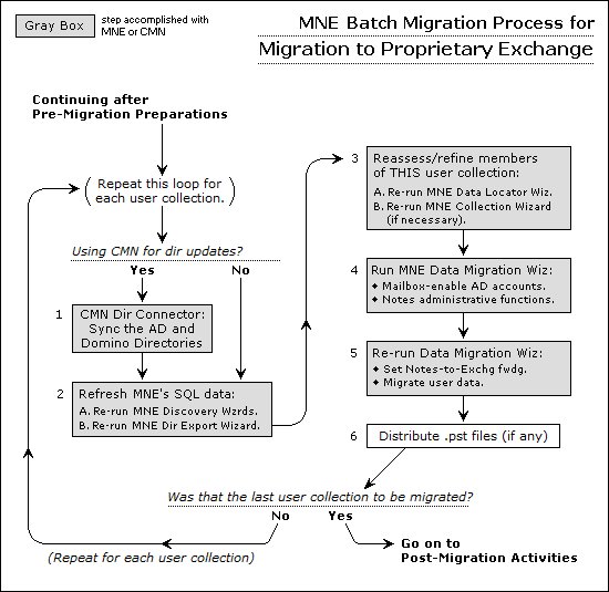 The following flow chart summarizes the batch-migration process for a proprietary Exchange target. The step numbers in the flow chart correspond to the step numbers in the process instructions. The instructions and field notes here and in the Migrator for Notes to Exchange Administration Guide contain special notes for optional and conditional steps in the procedures.