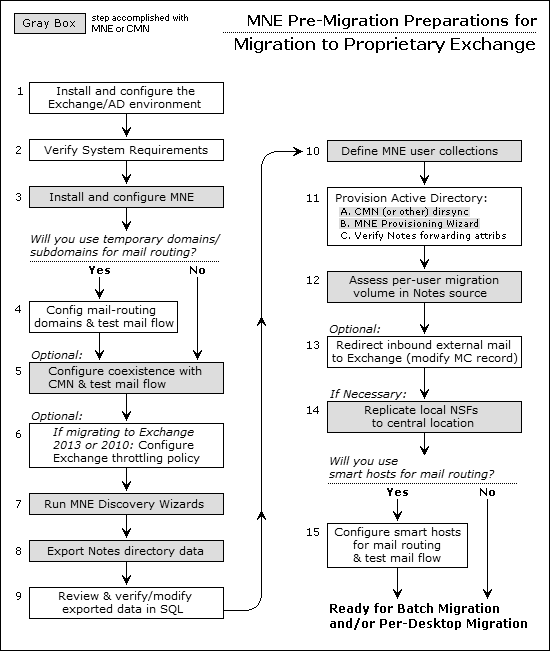 The following flow chart illustrates the necessary pre-migration preparations when migrating to a proprietary Exchange target.
