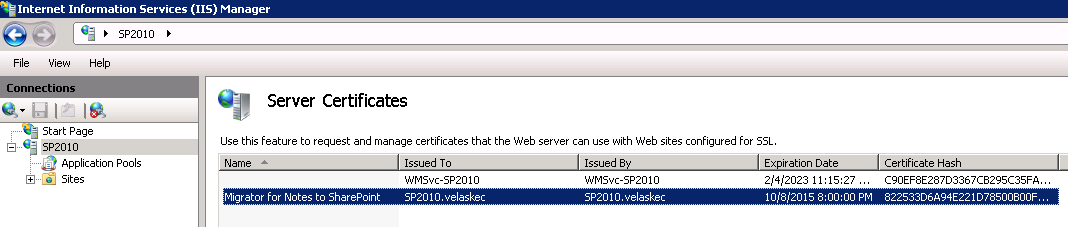 NOTE: If you do not perform these steps, the following error message appears: “Unable to connect to the Migrator for Notes to SharePoint Import Service ‘ https://<YOUR_DOMAIN_NAME>/ImportSession.svc’. Could not establish trust relationship for the SSL/TLS secure channel with authority <YOUR_DOMAIN_NAME>”. |