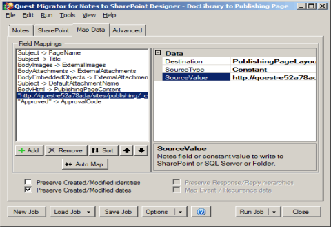 The jobs are also designed to set any migrated content to the “Approved” state. This is accomplished by mapping a constant value to the ApprovalCode field. Of course you can change this to a different constant value or even make it dynamic depending on the state of your Notes document.