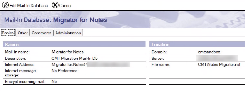 A Mail-in Database Document is required for mail to be delivered to the newly created server copy of the Migrator for Notes database. The procedure copies the database to the server and creates a Mail-In database document for the Migrator for Notes database.