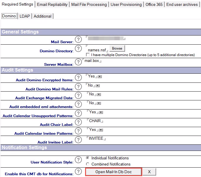 Create a mail-in database for Migrator for Notes database. Click on the Server Db Copy and Mail-In Db Doc button to create a copy of the Migrator for Notes database on the Domino server and configure the Mail in Database document