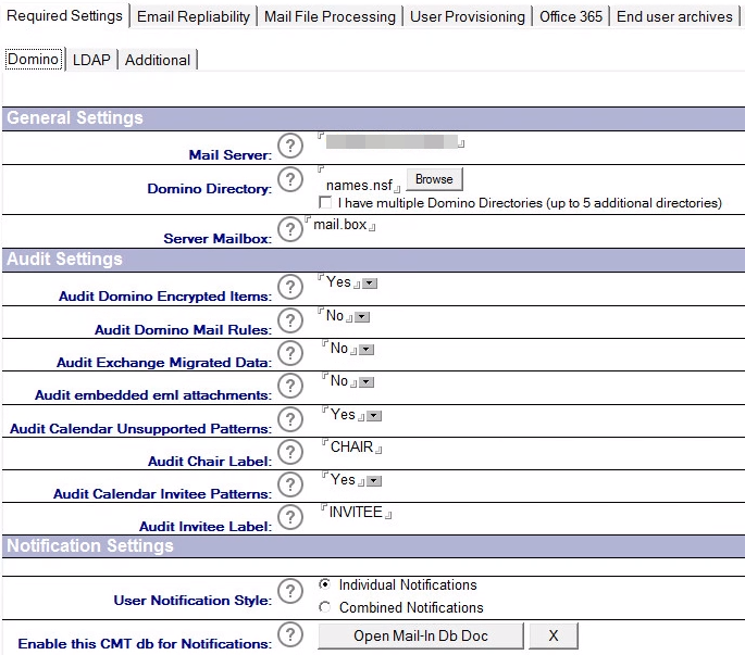 Before any migration can be performed, the Required Settings tab must be completed. Two of the most important entries in this tab are the Mail Server and the Domino Directory. The specified Mail Server name is used to access the Domino Directory. The Domino Directory is used to retrieve the information required to import and create the User Mail, Rooms & Resources Databases, Mail-in Databases, and Discussion & Document Library Databases control documents.