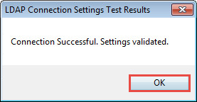 The LDAP Connection Settings Test Results message box displays indicating that the settings were validated and the connection was successful; click OK: