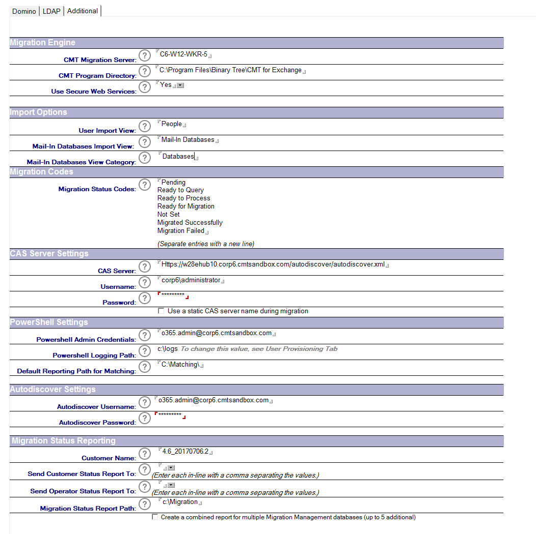 Configure these settings with the names of the views to locate and import User and Mail-in Databases information. Also, specify the Migration Status Codes that can be assigned to users’ mail and databases control documents. You can assign a code to a user to update its status and view users based on their status codes. This helps in providing a better picture of the migration progress.