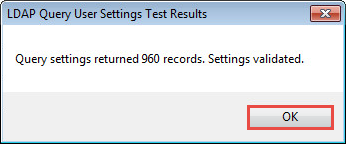 The LDAP Query User Settings Test Results message box displays; the query setting is validated and some records are returned; in a production environment, ten records should be returned always; click OK: