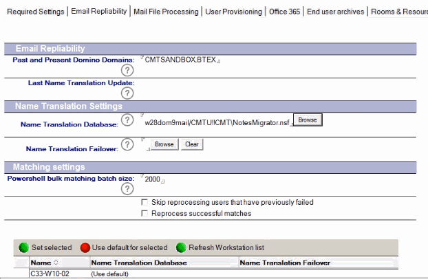 The Name Translation Database table allows you to set the Name Translation Databases and Name Translation Failover Databases on multiple workstations. Click Set selected to define a Name Translation Database and Name Translation Failover for the selected workstation to use instead of the primary (default) databases defined above. |