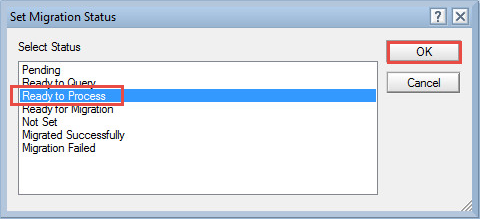 2. From the Set Migration Status dialog box, select Ready to Process and click OK: