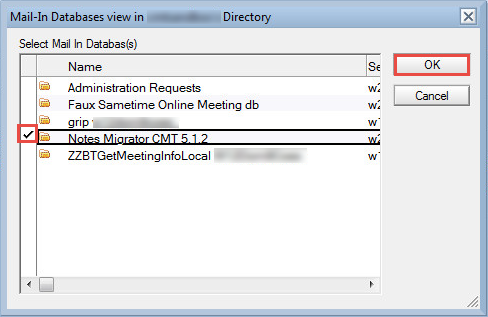 4. From the Mail-In Databases view in <Domino directory> dialog box, select the mail-in database that you want to migrate, and click OK: