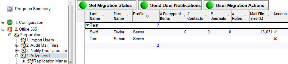 Once a user has been successfully audited, a green checkmark will appear in the Mail Access/Access column of some subsequent views (see Send End User Notifications View screenshot above). This green checkmark will only appear if the Audit Mail Files step has been completed successfully.
