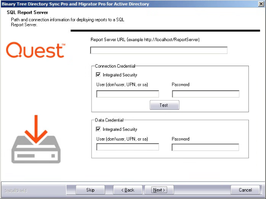 If you selected to install the optional Reporting feature, the SQL Report Server screen appears. Enter the Report Server URL and select the appropriate Connection Credential and Data Credential options. Clicking the Test button to verify the SSRS connection credential is a best practice. See the Appendix of this document for information on verifying the Report Server URL. Click Next to continue. If SQL Server Reporting Services (SSRS) is not set up, click Skip and OK on the confirmation window.