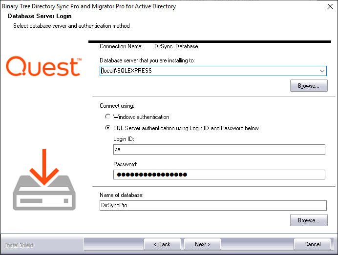 It is recommended to select “SQL Server Authentication” during the Directory Sync Pro for Active Directory/Migrator Pro for Active Directory server console installation if multiple people will be accessing the Directory Sync Pro for Active Directory/Migrator Pro for Active Directory web user interfaces. Otherwise, if “Windows Authentication” is chosen during installation, create a security group in AD and assign DB Owner rights to the Directory Sync Pro for Active Directory SQL databases and add all the users that need access to the console as members. |