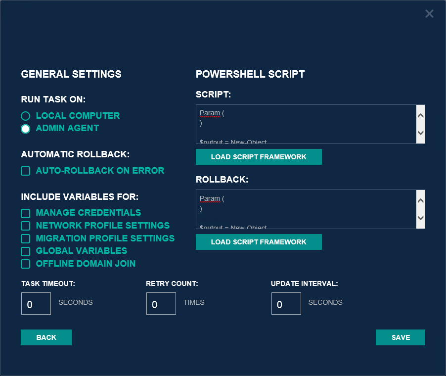 4. Add a Task to the new Custom Action. The "Run On Admin Agent" option must be checked. For this scenario, select "PowerShell Script" and edit the script. The script can call whatever credentials the PowerShell script should run under on the Admin Agent. The provided PowerShell script needs to clearly identify what Users are required to move and where the final destination is. A sample PowerShell starter script that moves users from one OU to another is available here. The provided sample script is meant to showcase the flexibility of the Admin Agent and is not representative of the definitive or best practices scripting method by which to accomplish moving users from one OU to another.